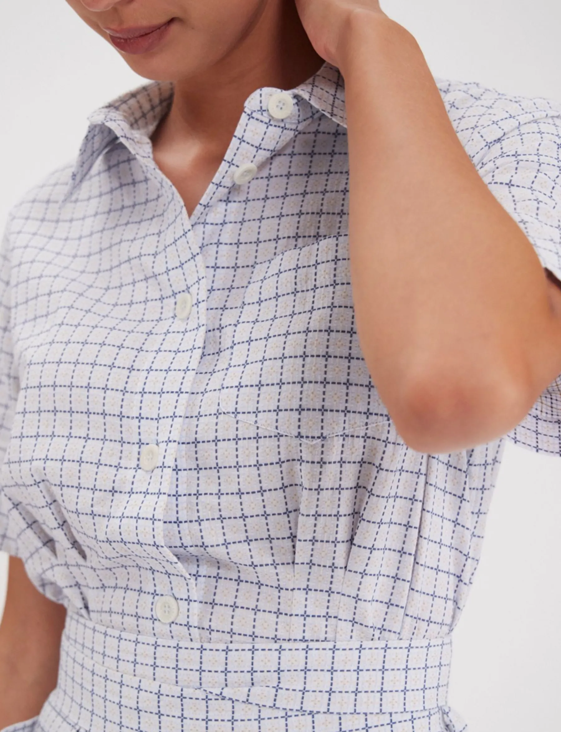 Stella Shirt DressFitted cutLength below the kneeShirt collarButton front closureShort sleevesWelt pleat detail at waistPatch pockets at front and chestTie belt at waist
