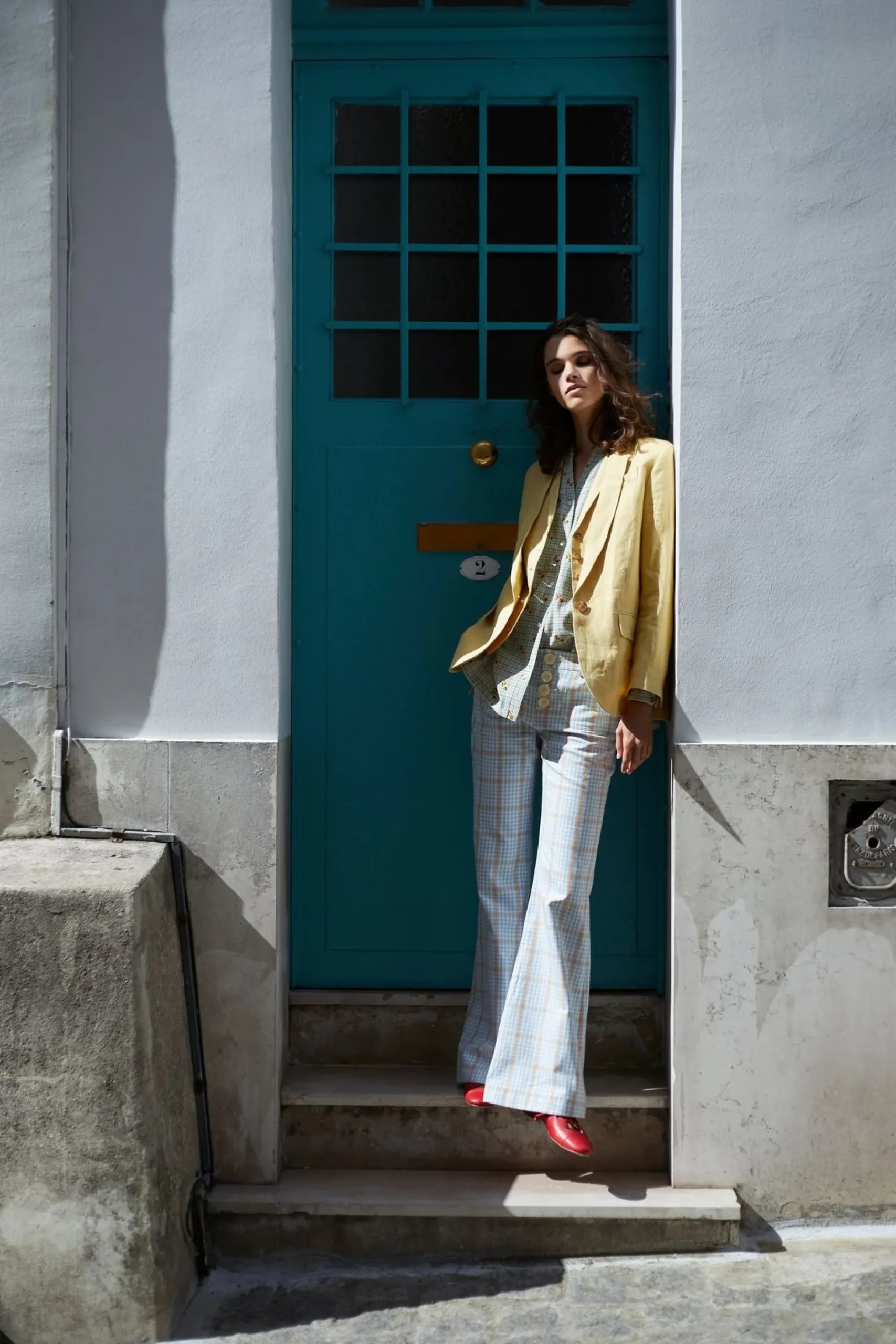 The iconic Charlotte trousers are back this season in a new version. Its flare cut, fitted to the knee and widening towards the bottom, elongates the silhouette in a very flattering way. It’s inspired by the seventies and will give you a glamorous look this summer, especially in this spectacular and highly original printed fabric. Every detail has been crafted, including the buttons and pockets, to give you elegance and style.