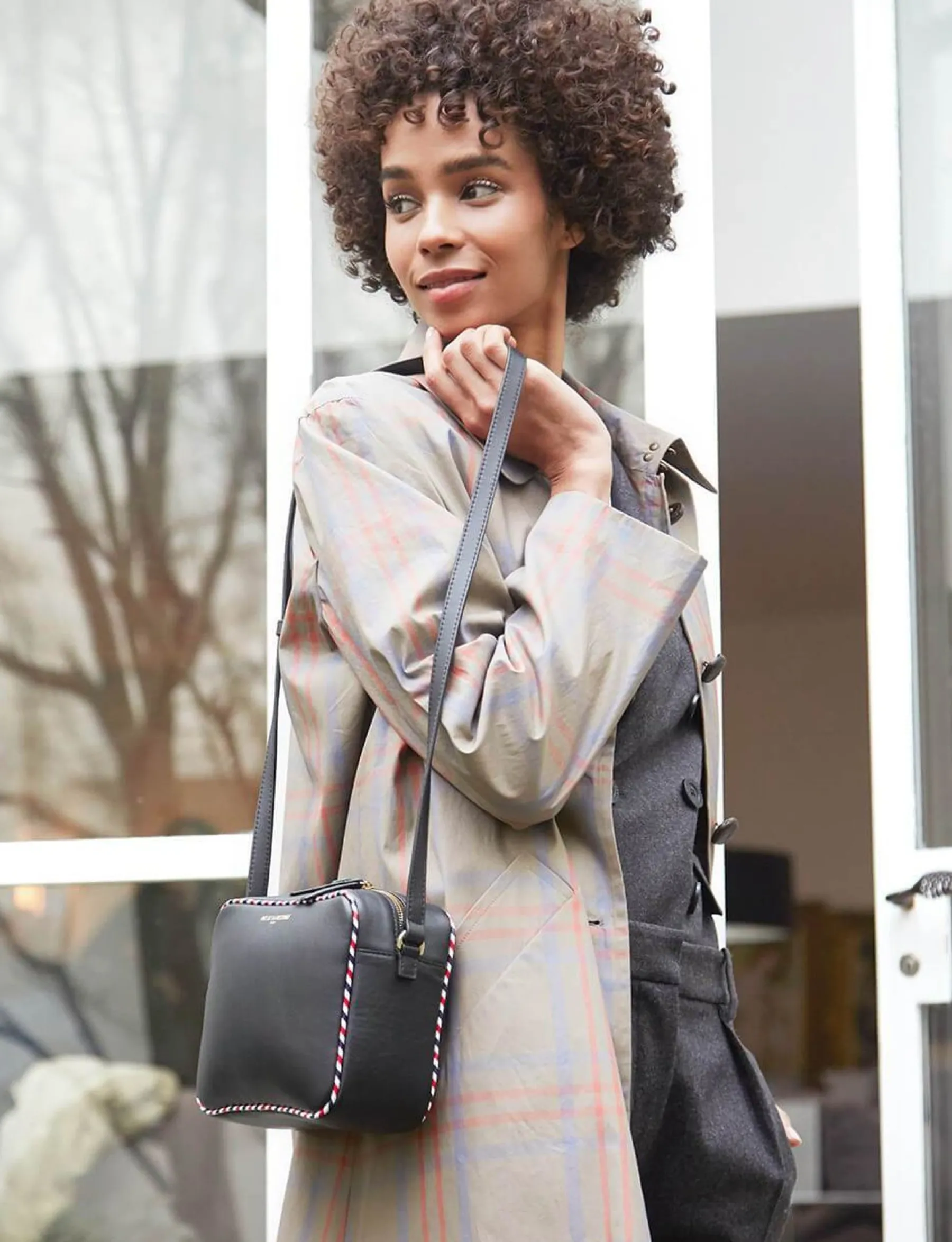 Inspired by the mythical camera bags of the sixties, and mixed with a deliciously retro, elegant and relaxed fashion spirit, it combines all the codes of the Parisienne woman and assumes her French origins and her taste for travel with its tricolour border that also recalls the days of Aéropostale. Playful, it comes in a wide range of seasonal colours and can be worn across the shoulder, on the side or cross-body.