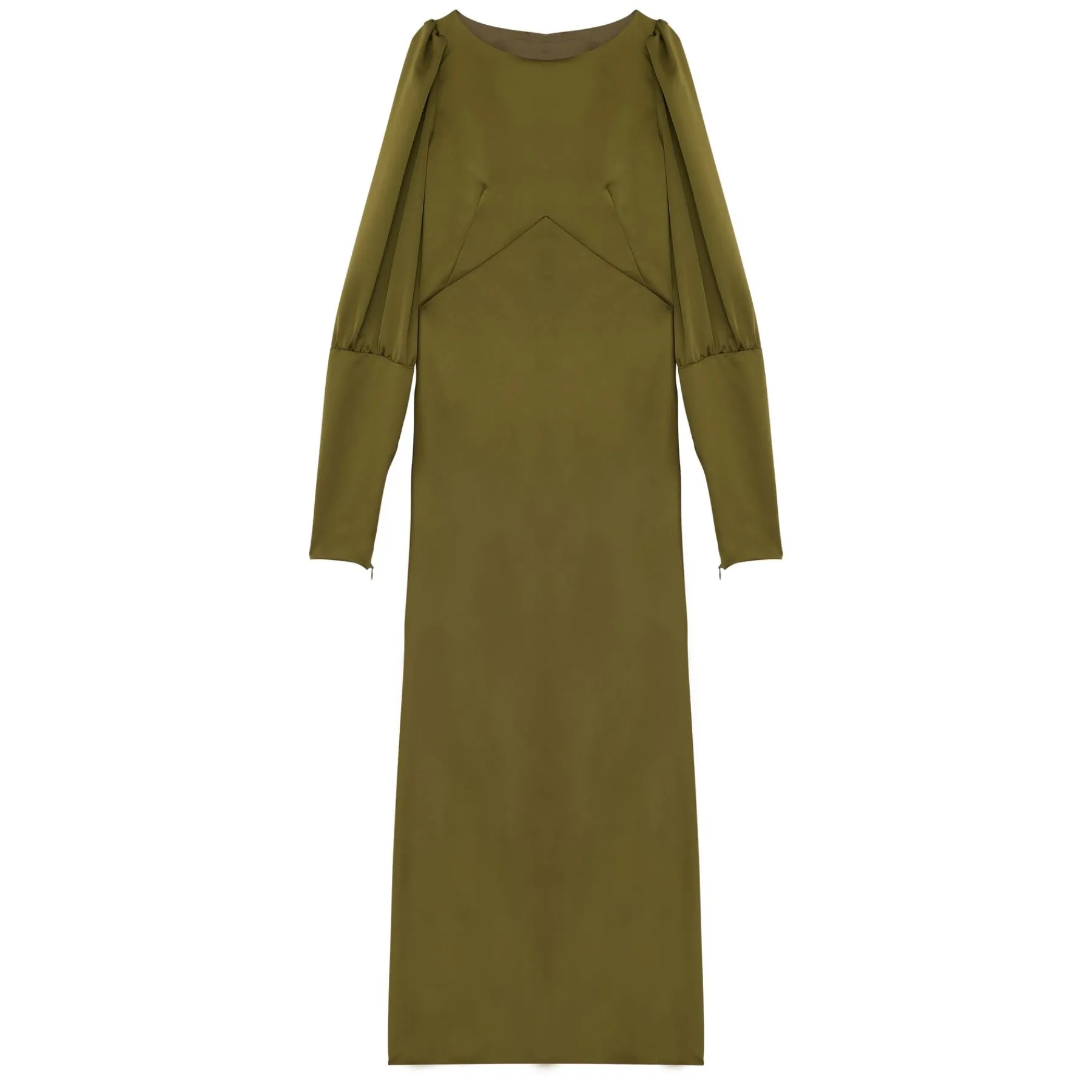 Alberta is a brand-new dress with a sophisticated cut. Long, it emphasises the upper body with pleats and gathered sleeves at the top, extended by slightly baroque cuffs that subtly enhance the silhouette, and continues with a flared cut at the bottom and the option of belting the waist at the back. The result is stunning!