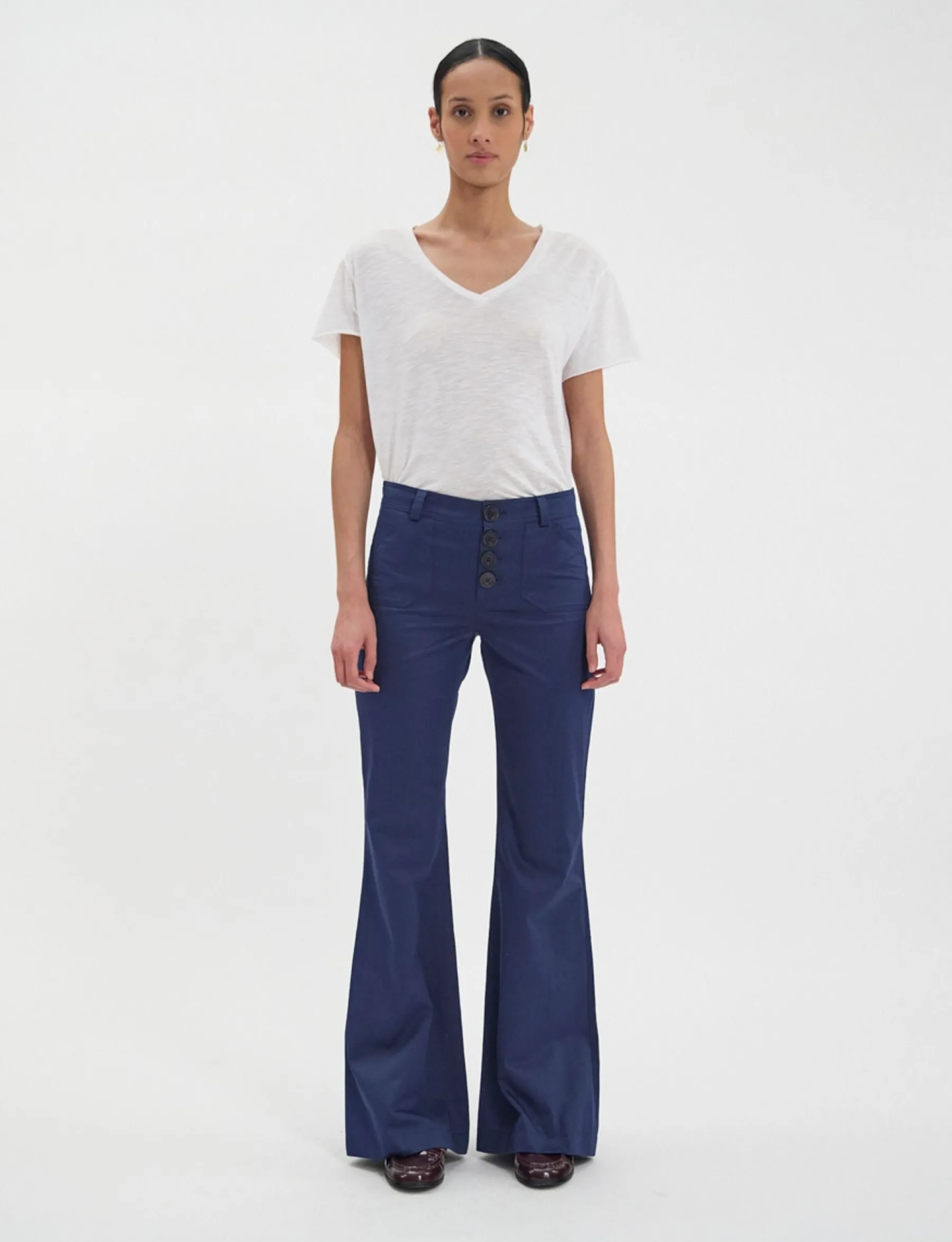 Charlotte flare trousersFlare cutNormal waistNbutton front fasteningFront patch pocketsBack patch and button closure