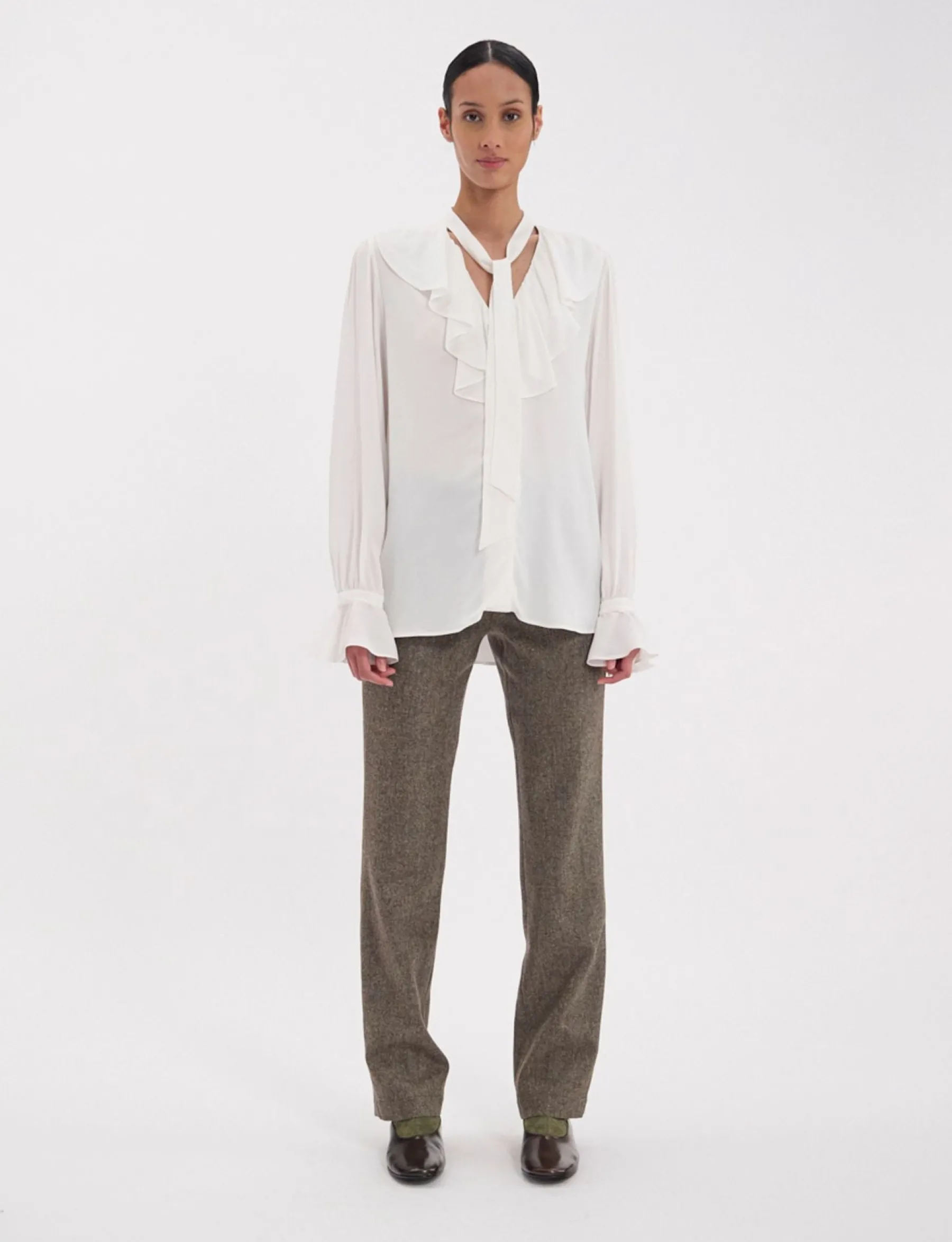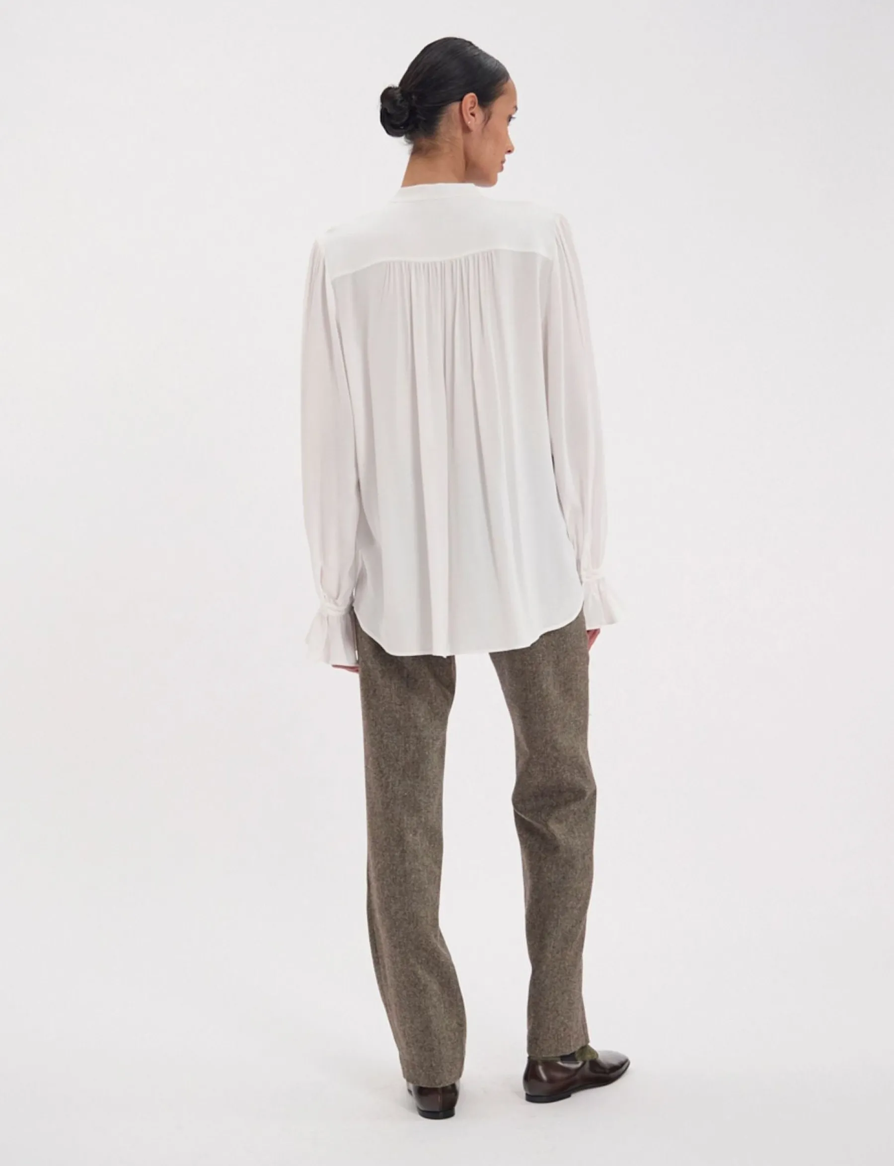 The new Fanfan shirt is not just out of the ordinary, it’s spectacular. It combines a loose fit with striking styling elements, such as its scarf collar, superb pleating at the front, ruching at the back and flared, buttoned cuffs. You’ll love wearing it, and the elegance it gives you.