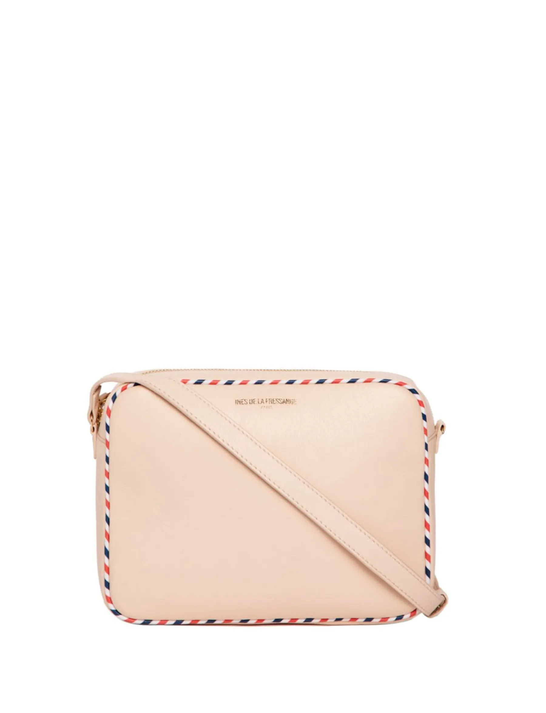 Inspired by the legendary camera bags of the sixties, this bag has a deliciously retro, elegant and relaxed fashion spirit. It combines all the codes of the Parisienne woman and embraces her French origins and her taste for travel with its tricolour border that recalls the days of Aéropostale. This playful bag is available in a range of seasonal colours, here in beige leather, and can be worn across the shoulder, on the side or cross-body