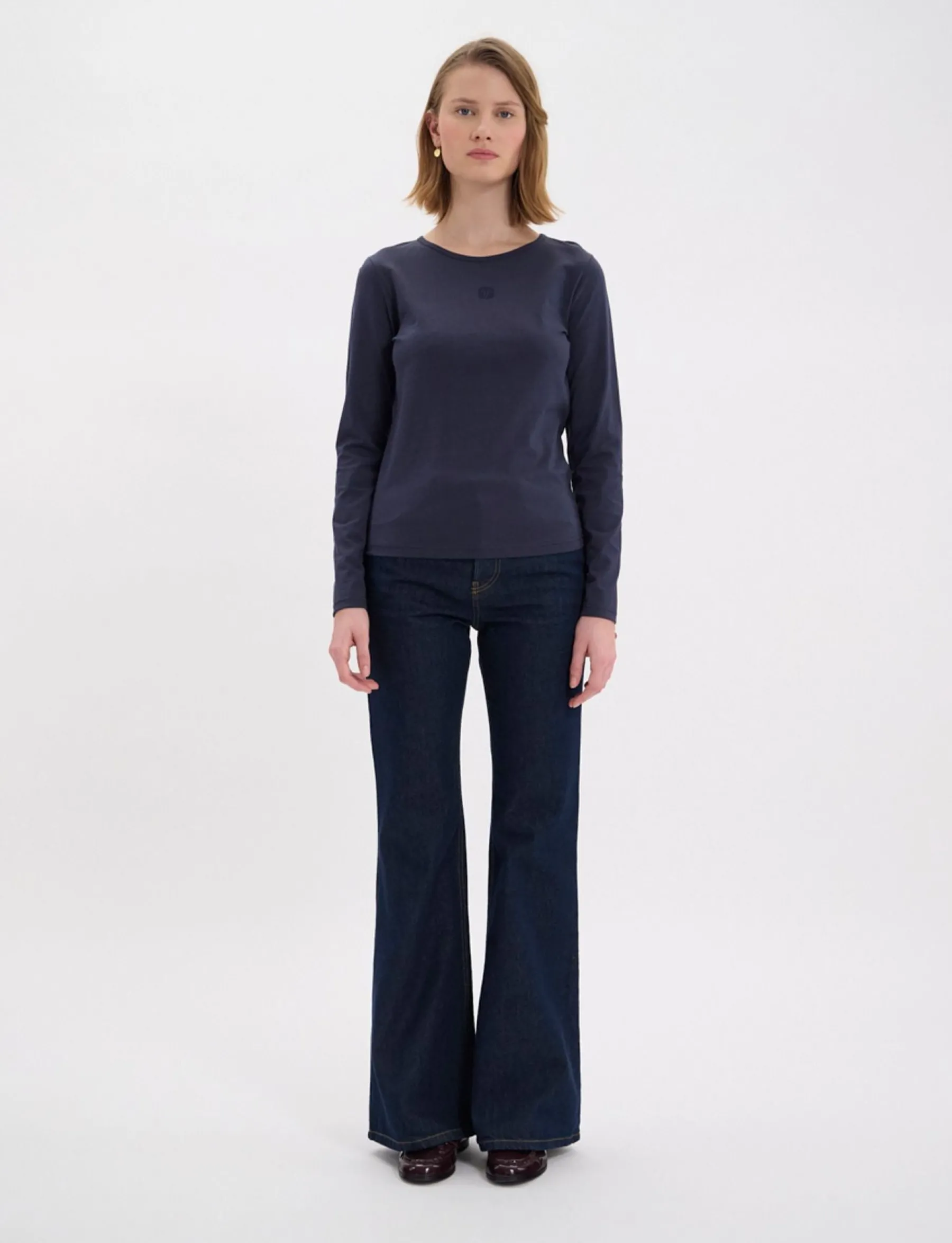 Cindy is a new top with a slightly slim fit, subtle, elegant details like the ribbed texture on the collar and bottom sleeves, and the House signature, our embroidered oak leaf. Made from organic cotton.