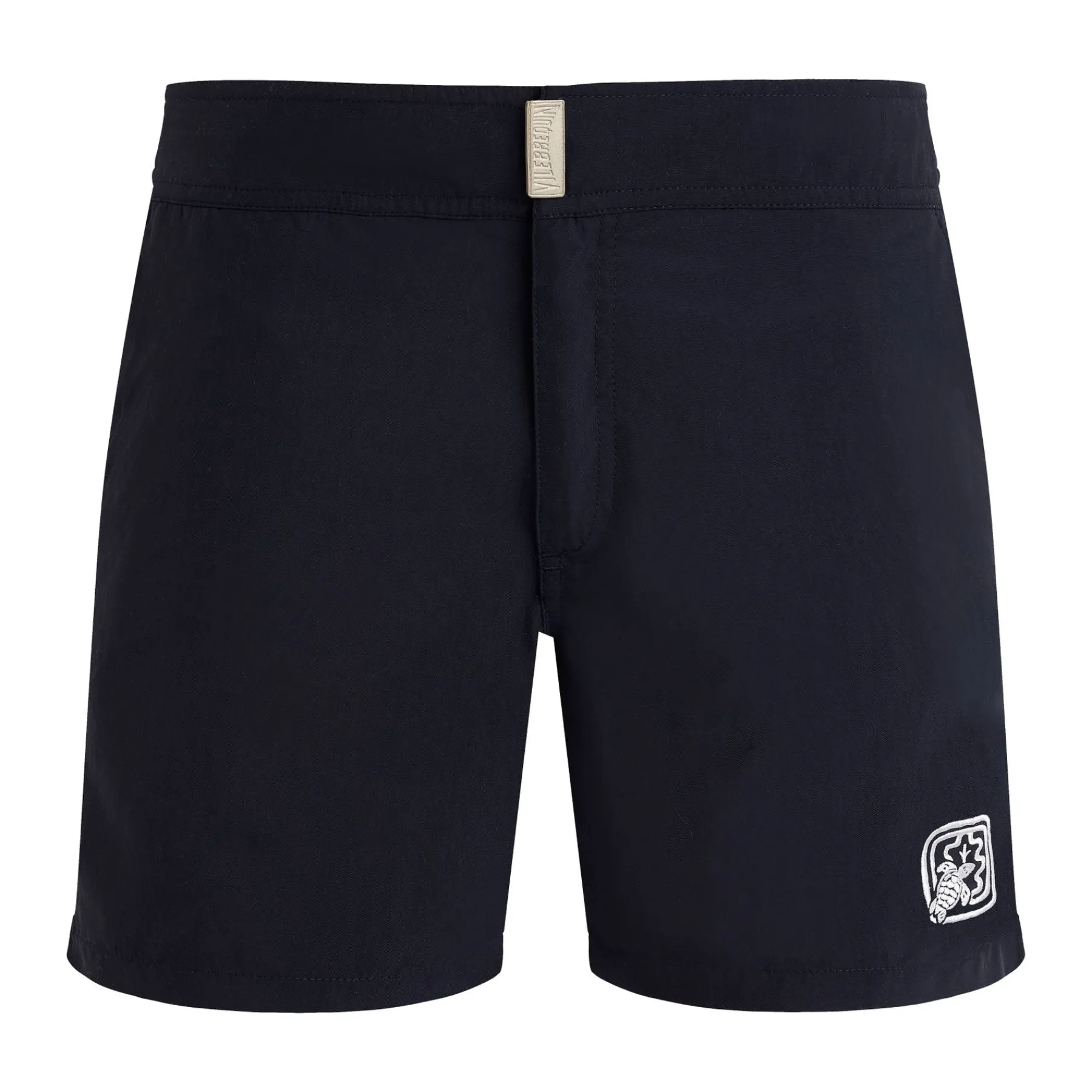 The Mirage swimming costume has been designed for men and benefits from the recognised expertise of Vilebrequin and the vision of elegance ofInes de la Fressange. It is part of the new capsule collection Vilebrequin and Ines de la Fressange Paris dedicated to the pleasures of the sun and the beach. Mirage is made from recycled polyamide and is available here in a superb navy blue. It has a number of refined styling details, such as a flat waistband with customised rectangle press studs, and features the 2 Maisons logo embroidered on the thigh. A guarantee of elegance and quality for summer’s most beautiful beaches!