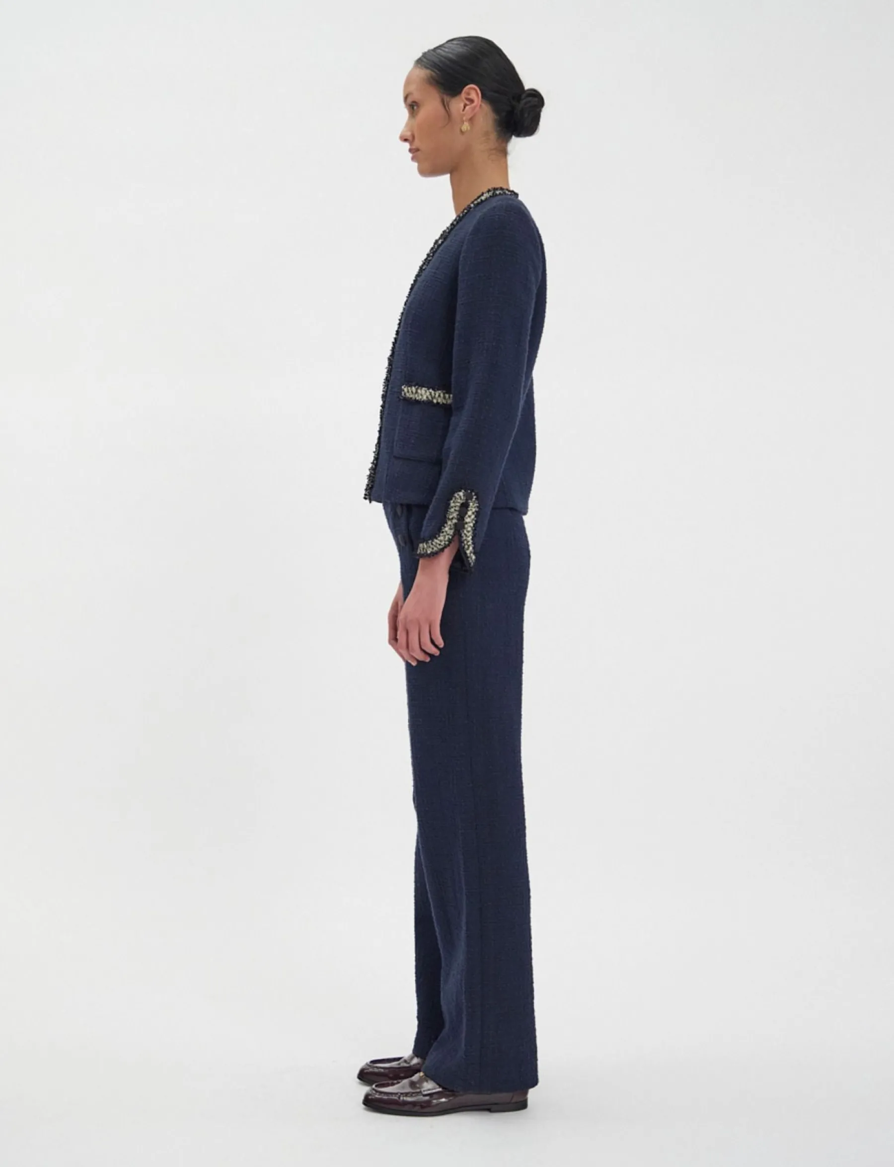 The new Misia jacket is already a classic. Particularly elegant yet extremely comfortable, its straight cut is accentuated by a braid, hand-applied in the traditions of sophisticated craftsmanship, giving it an irresistible allure. Sober yet dressy, it’s perfect for day or evening, dressing up any figure and always looking glamorous. It’s the perfect embodiment of French elegance.