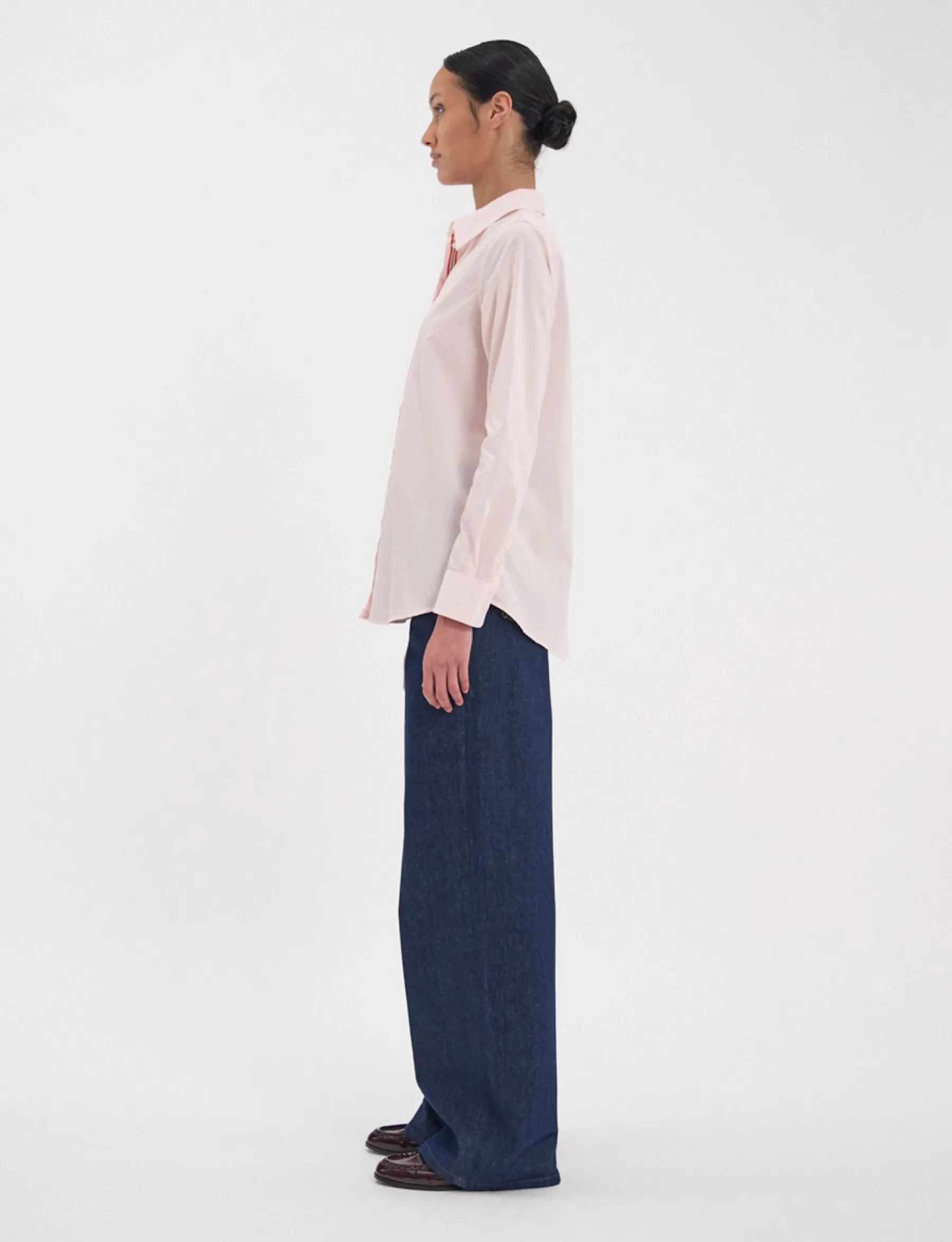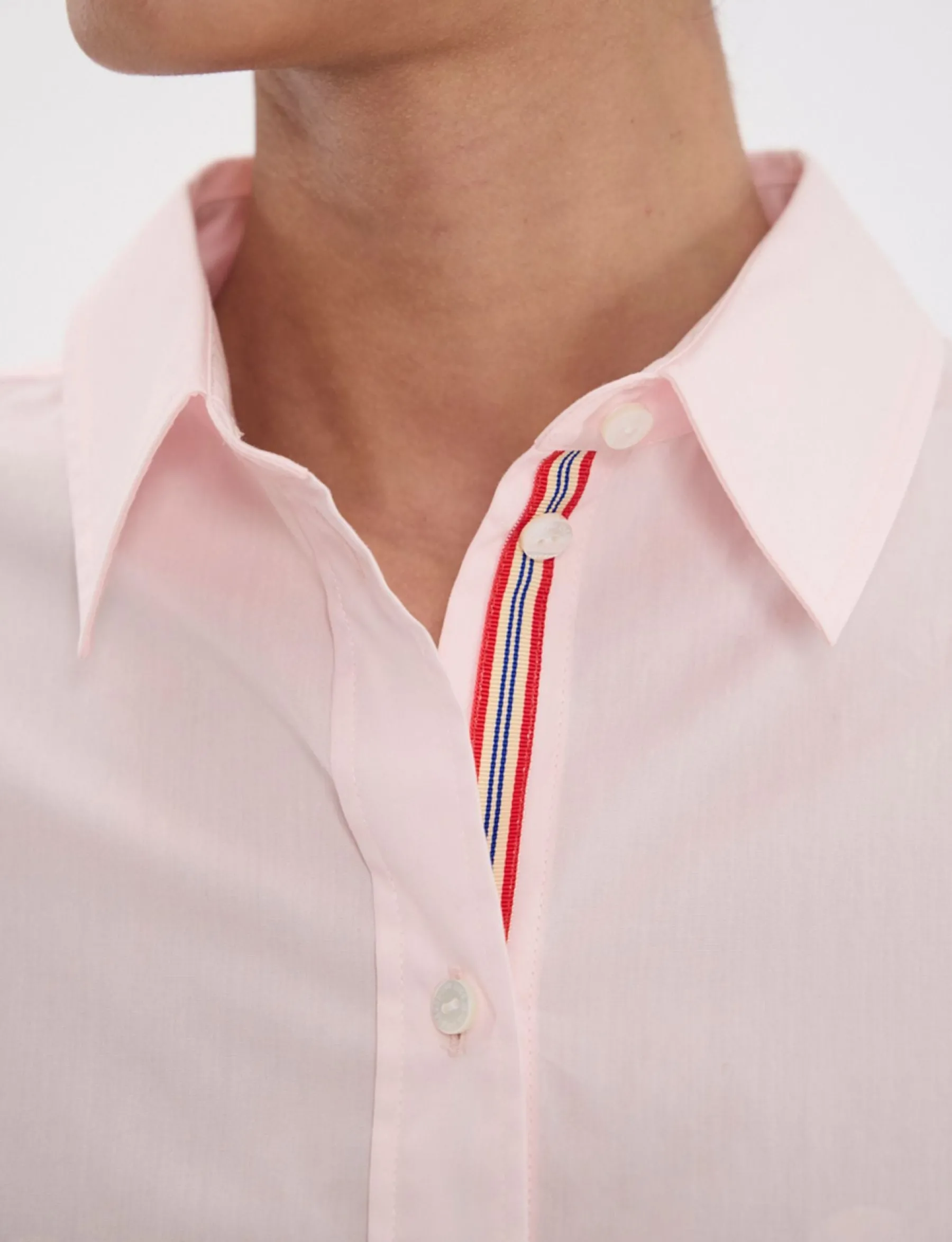 The Martin shirt is a must-have for every Parisienne, and Ines’ favourite… A timeless version in pale pink cotton, very slightly fitted, with the signature blue, white and red braid on the hem.