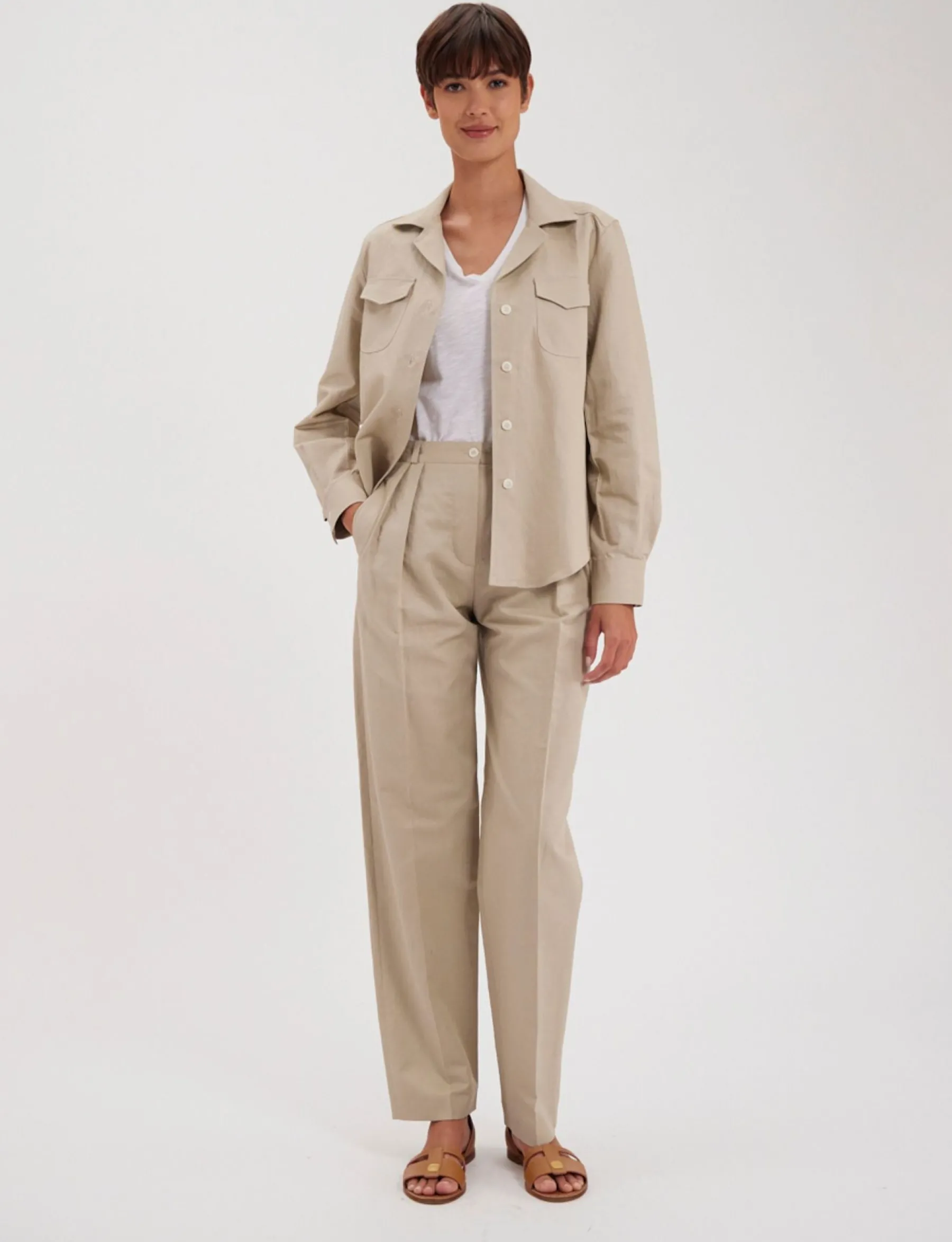 The Evana shirt is a straight-cut shirt in a linen-cotton blend, sober and original, that will enrich your wardrobe with a piece inspired by work styles, revisited with finesse. Its cut makes Evana very comfortable to wear, while the two patch pockets on the front add a touch of practicality and authenticity.